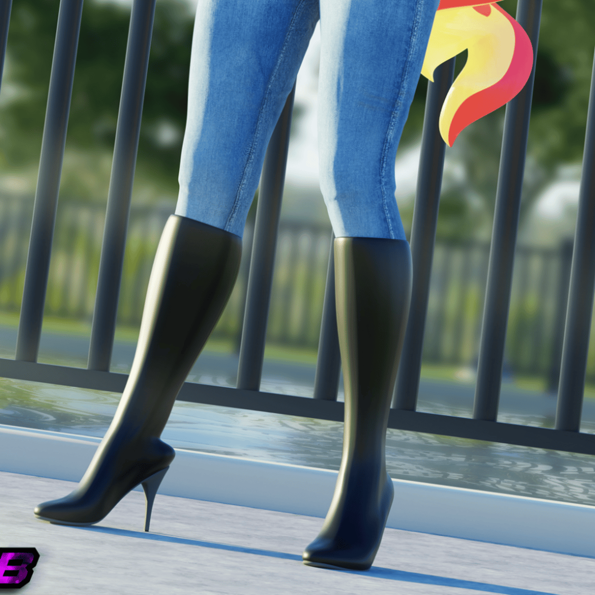 She is an anthro Pegasus wearing her black crop top bra, blue jeans and black knee high boots
