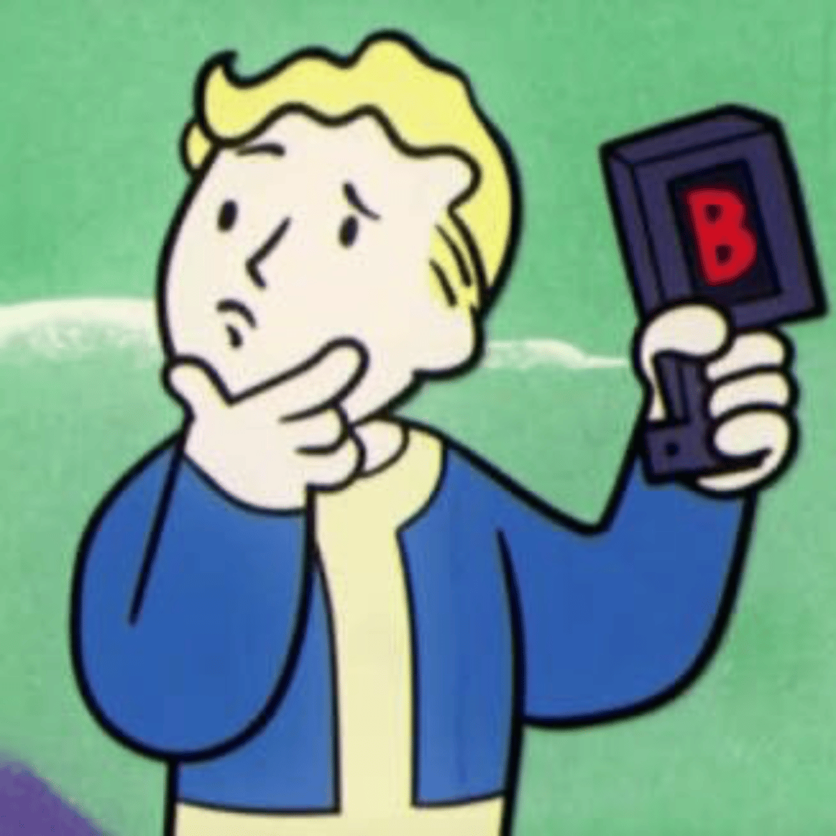 Vault Boy is the overseer of Vault 150 (a fictional vault). You're a settler from the commonwealth who got in by trading a few fusion cores you've gotten on your journey. (Imagine this in the Vault-Tec cartoon styles)