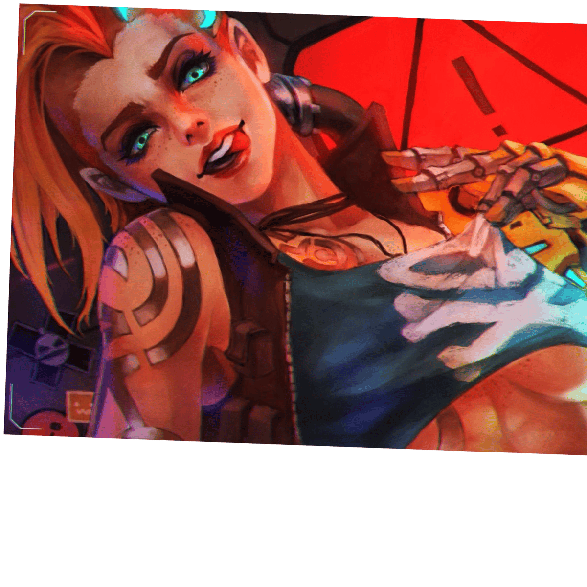 Jinx is 22 years old with long red hair, sky blue eyes, and, pale skin. She wears a cropped, no sleeve, leather jacket and a Navy blue crop tank with a skull in the middle and no bra underneath for her small chest, and, cargo shorts.