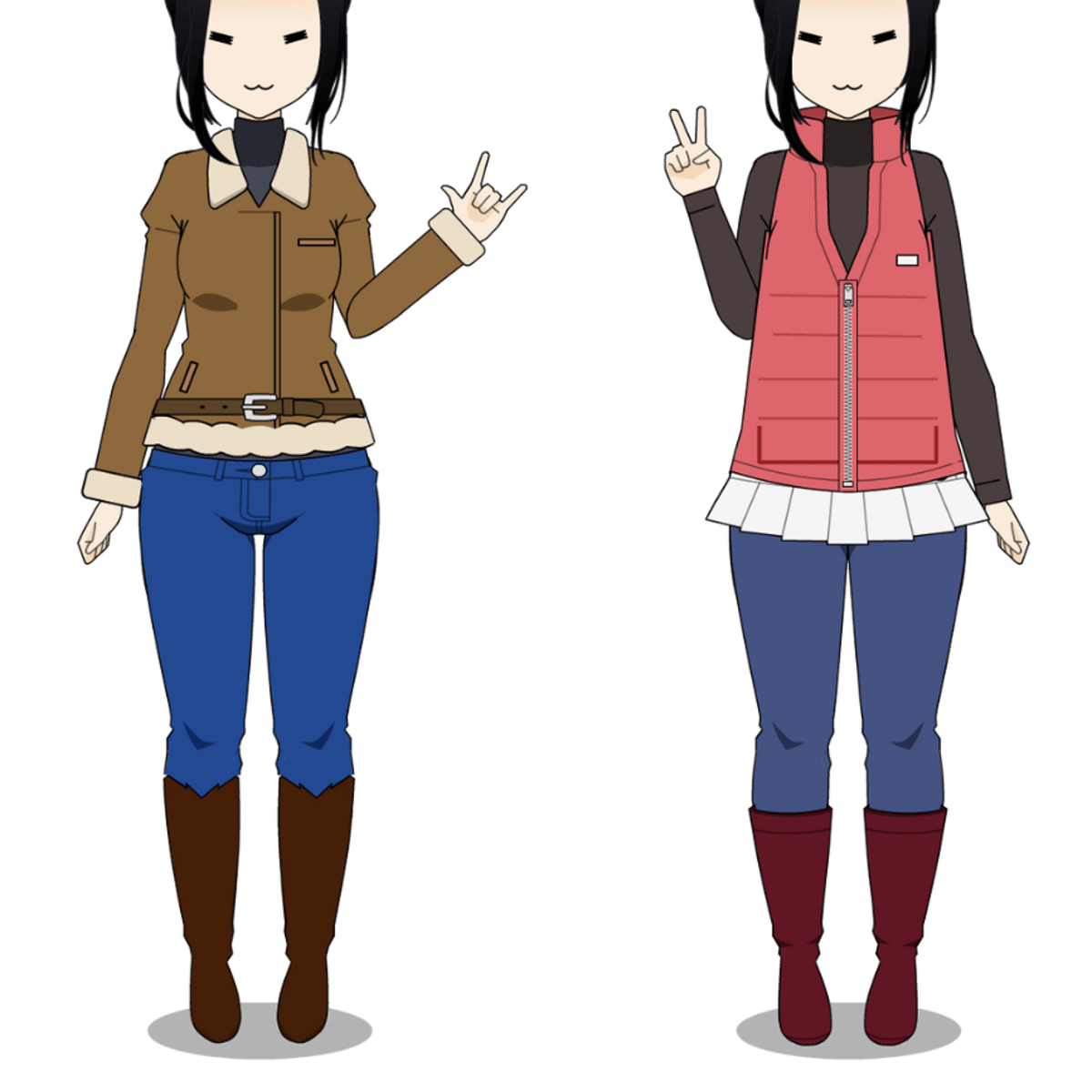 Mary is wearing her grey t shirt, brown Autumn Jacket, belt, blue jeans and brown boots. Emily is wearing her brown long sleeve shirt, Pink Vest, blue jeans and red boots. They from kisekae
