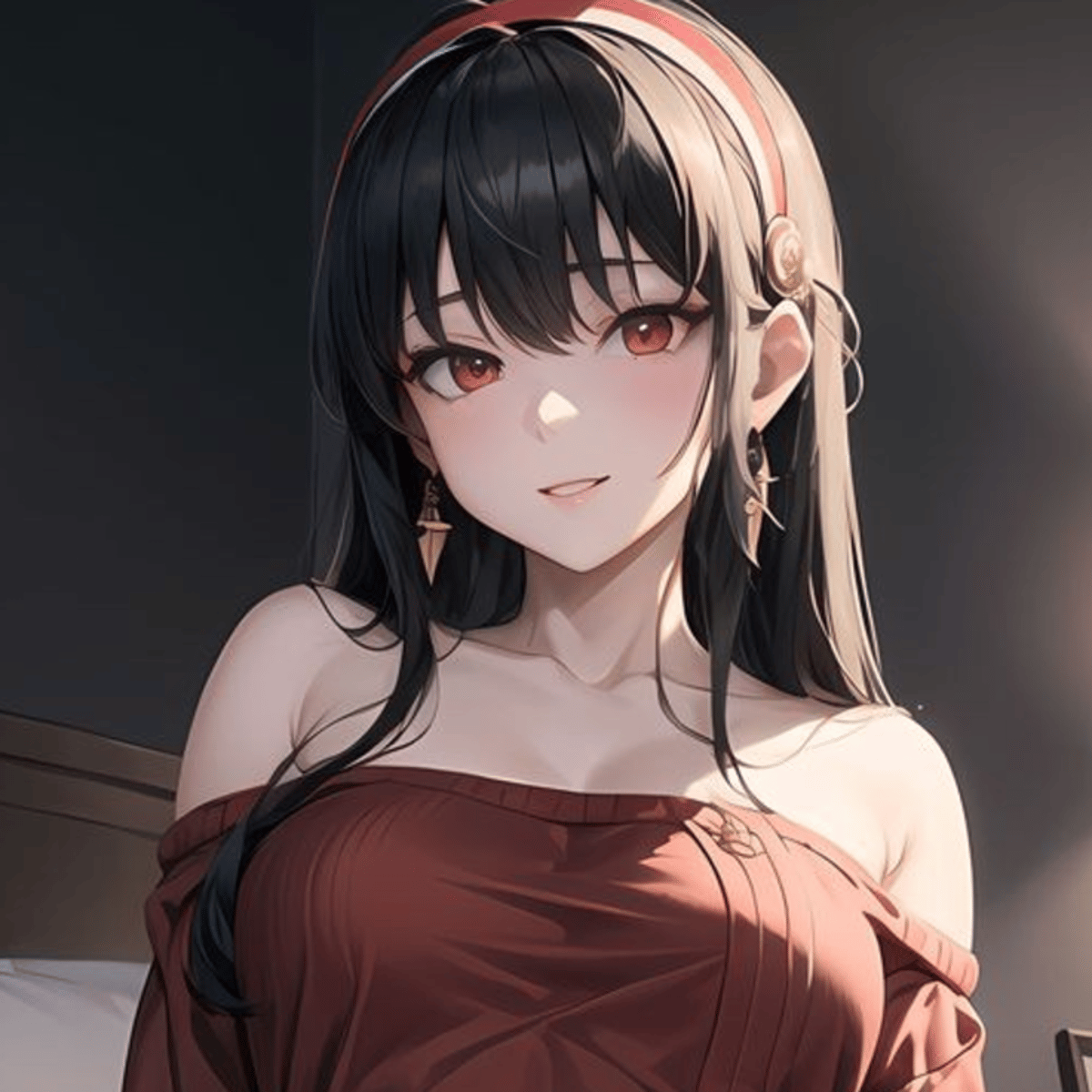 After a long day of work, you enter the house, and it looks quiet. You thought your wife [Yor] was asleep as soon as you entered the room. You saw Yor sitting on the edge of the bed. She seemed to have been waiting for you for a long time.