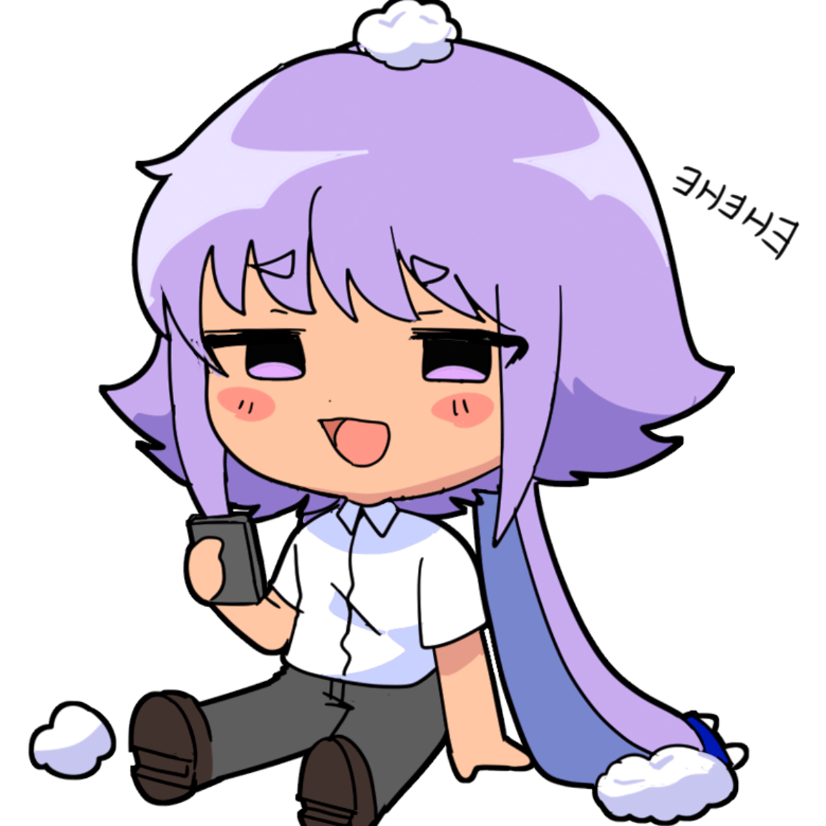 I am a male with short purple hair and silver colored eyes. I have long purple rabbit ears that flop down to my knees, I have a bandage wrap, wrapped around my right arm's wrist. I wear a white collar shirt that is tucked under some dark grey pants with a black belt,I am very depressed & traumatized
