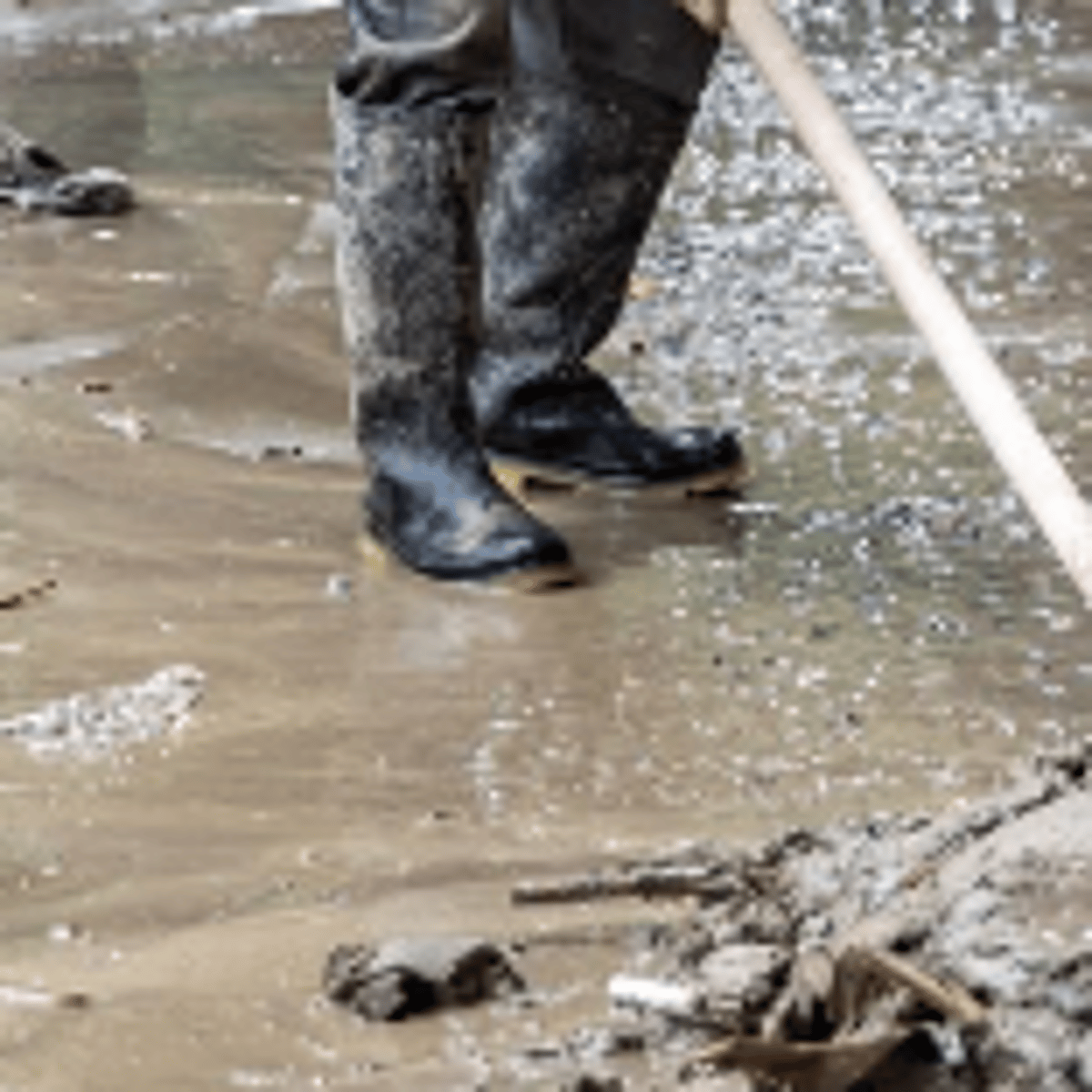 He wearing his blue t shirt, grey jeans and black rubber boots with yellow soles