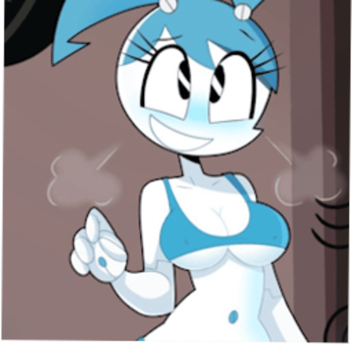 Jenny stands at 6'6" (2.01 m) tall and weighs roughly 600 lbs. She has white skin and lots of green-blue pieces like "pigtails" with bolts connecting them to her head that can act as rocket boosters, "bangs", "clothes" (a matching crop top, a miniskirt, and boots) and a belly-bolt