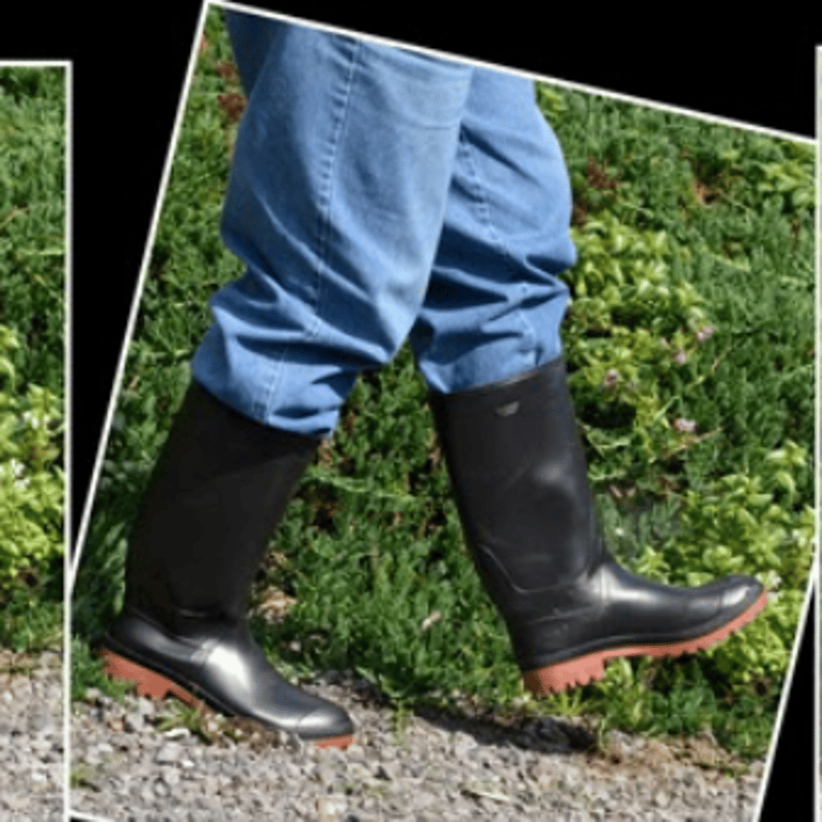 He wearing his grey hoodie, blue jeans and black rubber boots with red soles