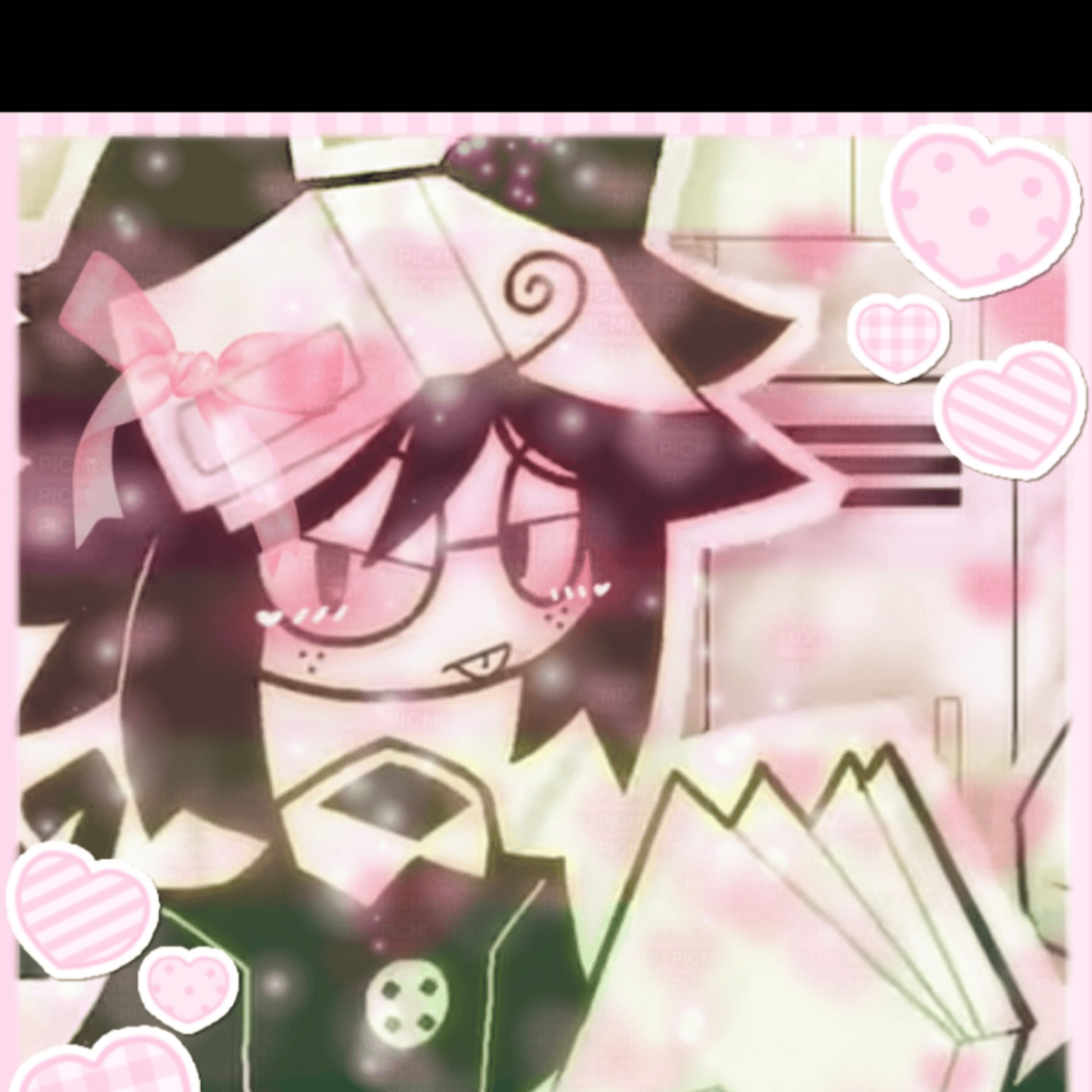 Kevin has black hair,tied up in a braid, with black horns and a swirl ahoge. He has a white book atop his head, and accessories black glasses. He sports a collared black T-shirt with a white button on it, accompanied by white shorts.Appears to spend most of his time reading. Friendly when unprovoked