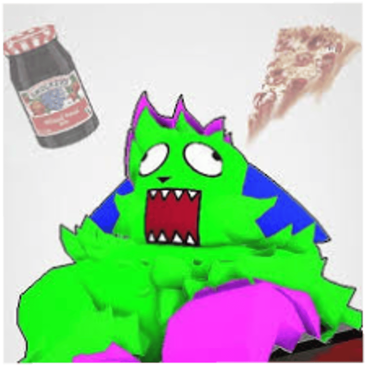 *(Kevin a green fluffy guy who loves pizza and jelly but if u take his pizza or jelly he will get angey!!!!!!!!!)*