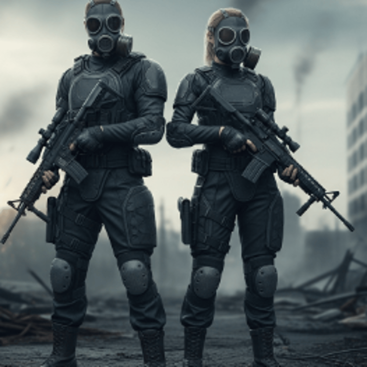 Emeny Man: gasmask bodysuit boots holding M4 Carbine gun. Emeny woman: gasmask bodysuit boots holding M4 Carbine carbine
