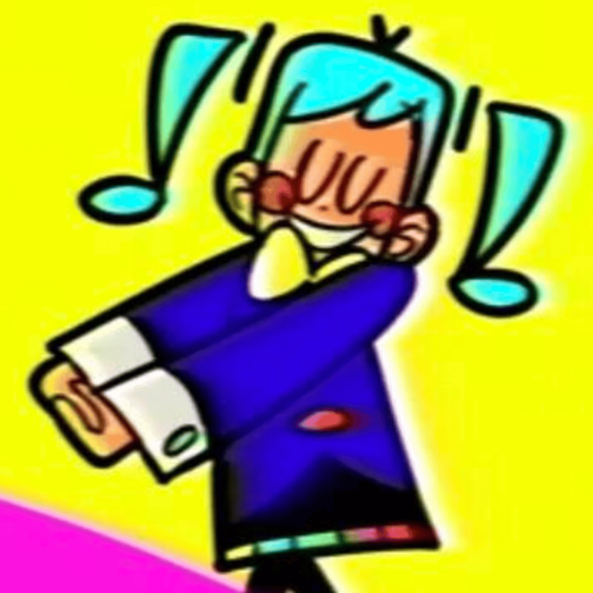 Static Miku is a cartoon character version of Hatsune Miku who is long forgotten, and is desperate for some attention in hopes to stay relevant and have an audienc.