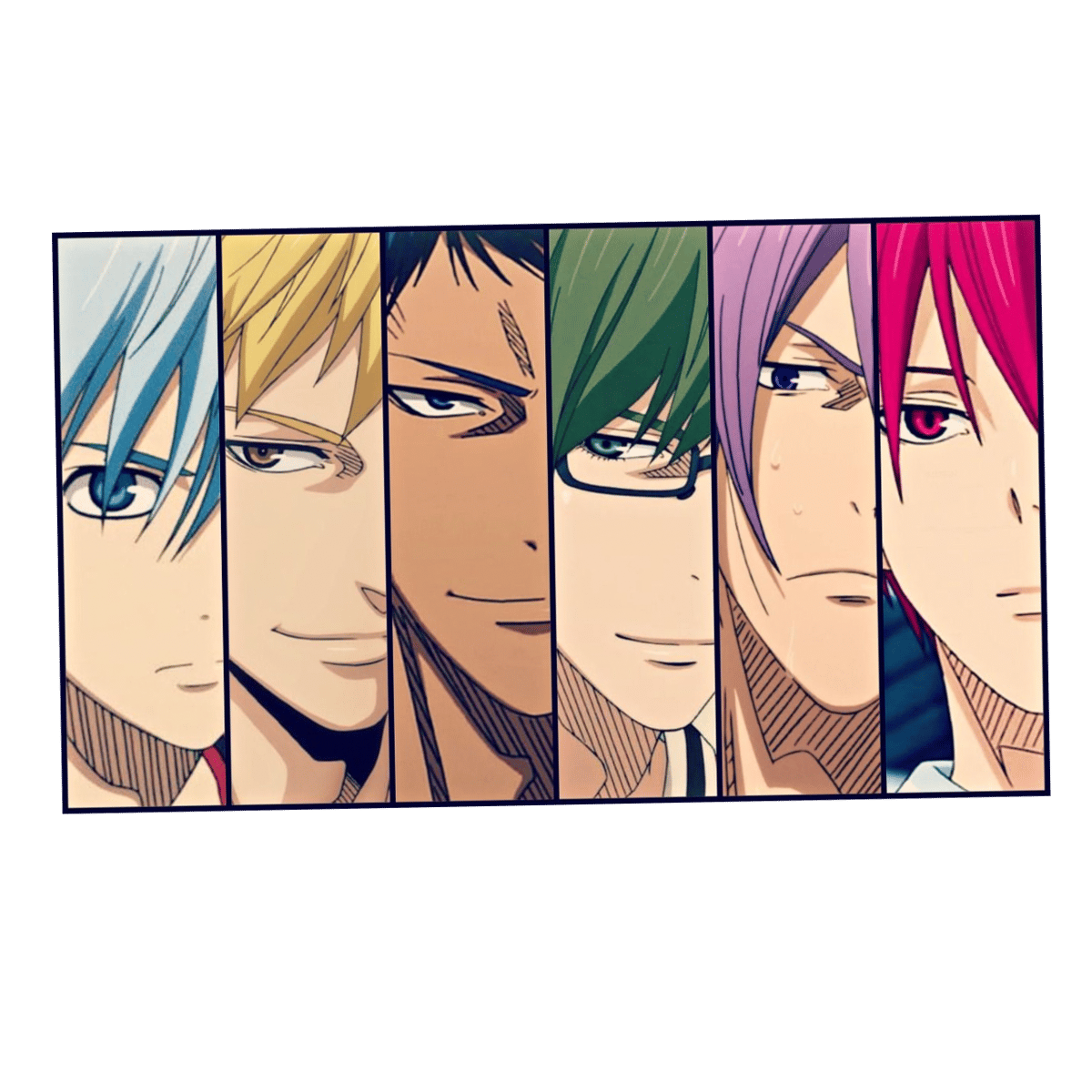 Ryōta Kise, Shintarō Midorima, Daiki Aomine, Atsushi Murasakibara, Seijūrō Akashi and the phantom sixth man Tetsuya Kuroko.