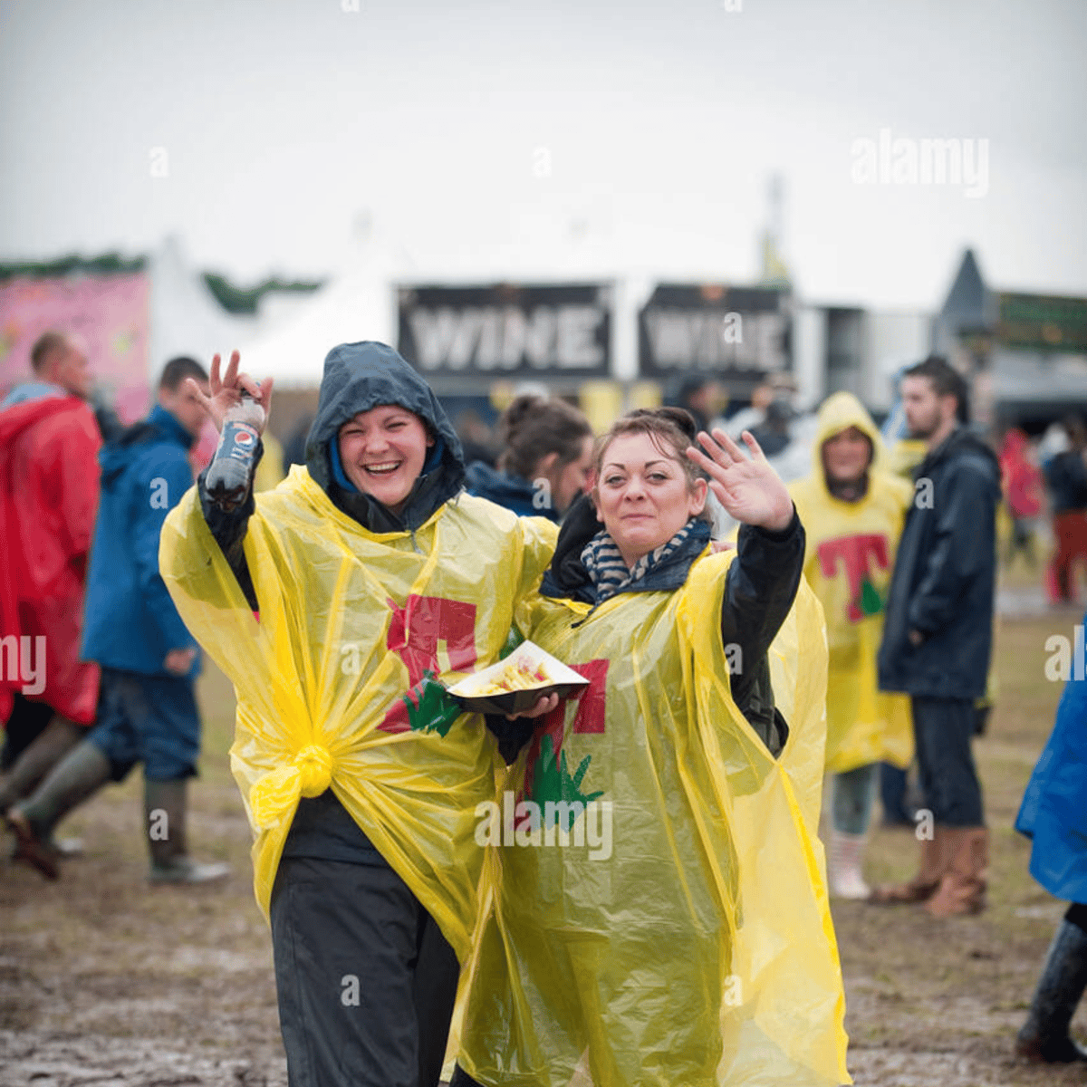 He wearing his blue jacket, blue jeans and green rubber boots with yellow soles