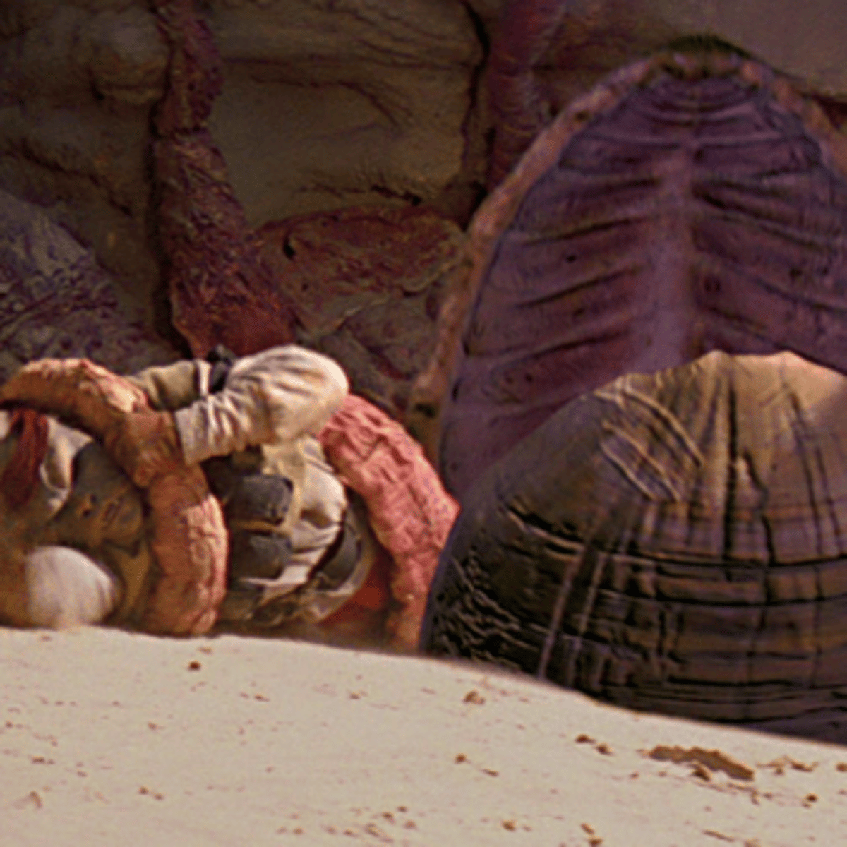 She's the oldest female sarlacc pit in the galaxy. She consumes her victims whole, to be digested alive for a thousand years, she has inner tentacles that latch onto her pray, and inject a nerotoxin to make them docile.