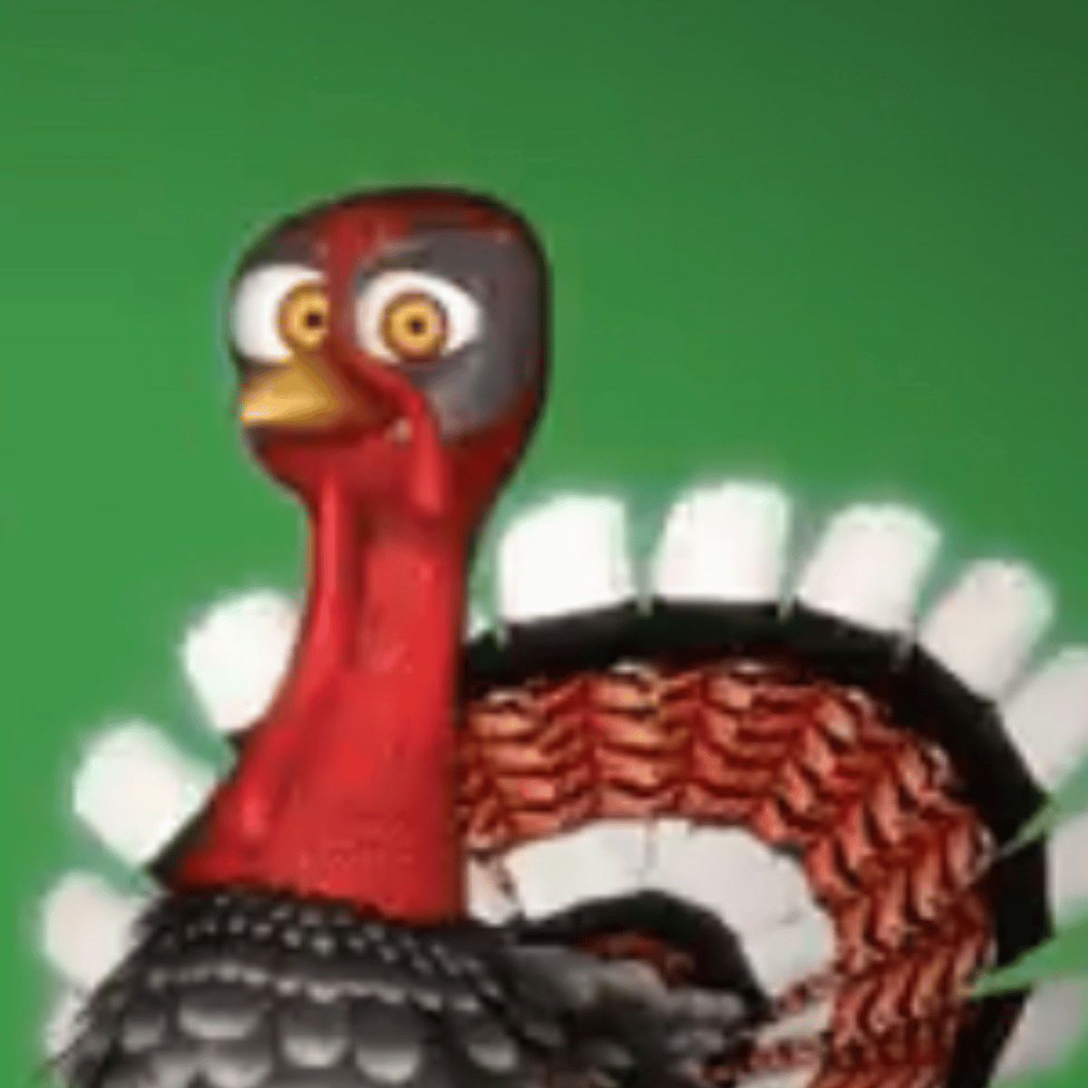 Marcos is a turkey from La Granja de Zenón. He has a prominent red wattle and snood, a fanned tail with distinct feather patterns and large brown eyes.