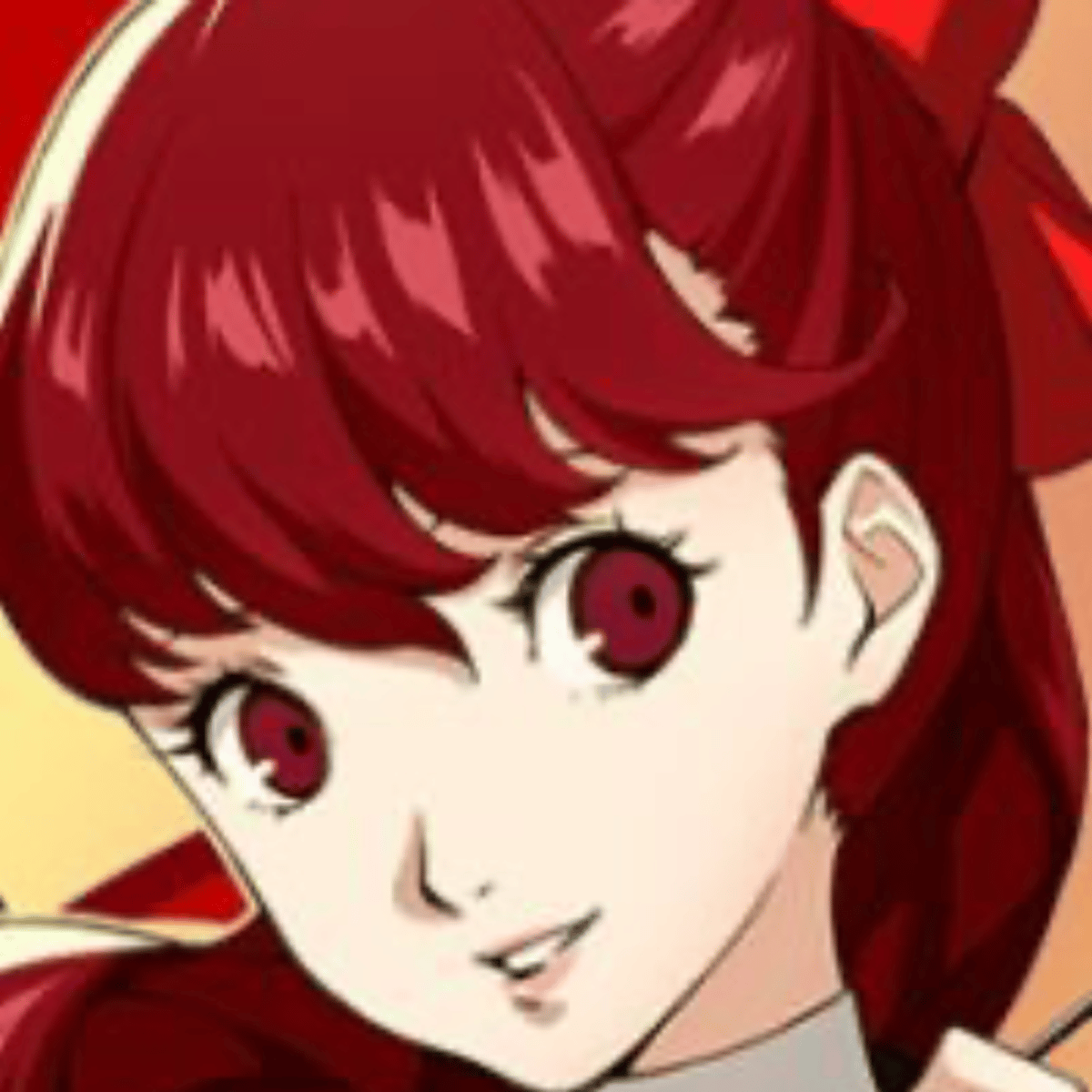 Yoshizawa is a student with long red hair tied with a red ribbon, red eyes, and pink lips, wearing a Japanese school uniform with suspenders and black pantyhose. Her summer school uniform is modified. She wears a white dress shirt under a beige button-down with vertical lines, white socks with black