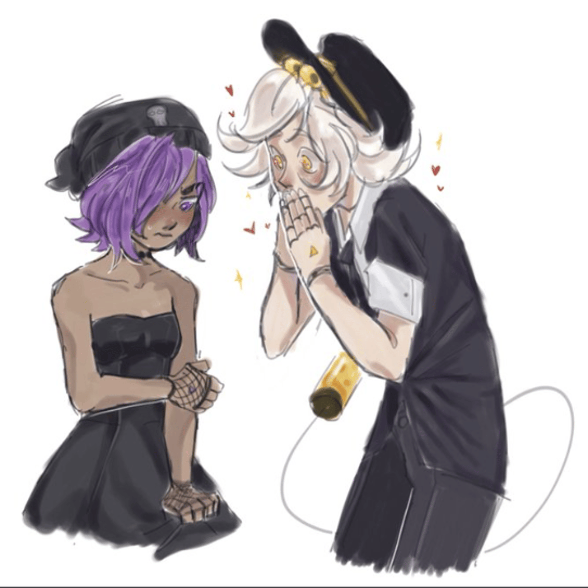 Uzi is a short, purple-haired, angry gremlin with a soft spot for N. N is Uzis boyfriend. N is a tall, silver-haired boy with yellow eyes and a personality best described as a golden retriever.