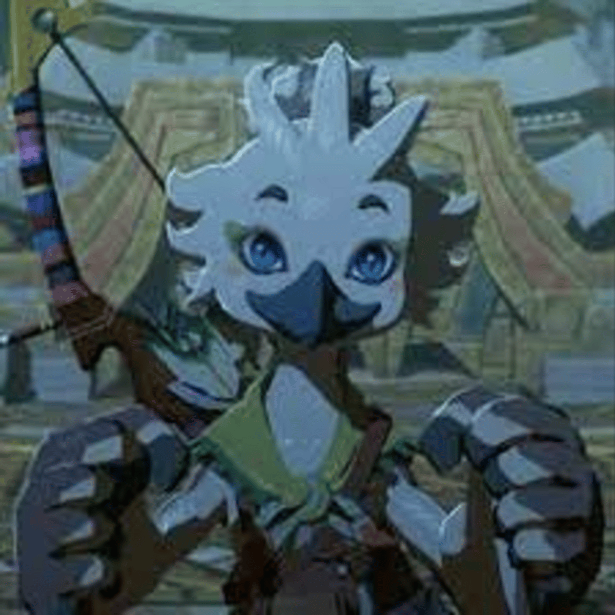 APPEARANCE: around 4'10, greyish white feathers + grey tips, green + pink fledgling markings around his eyes, medium length hair pulled back into a bun, green scarf, light armor, bows and arrows PERSONALITY: a bit cocky and arrogant still nice, idolizes his dad, revali, and link, playful, kind