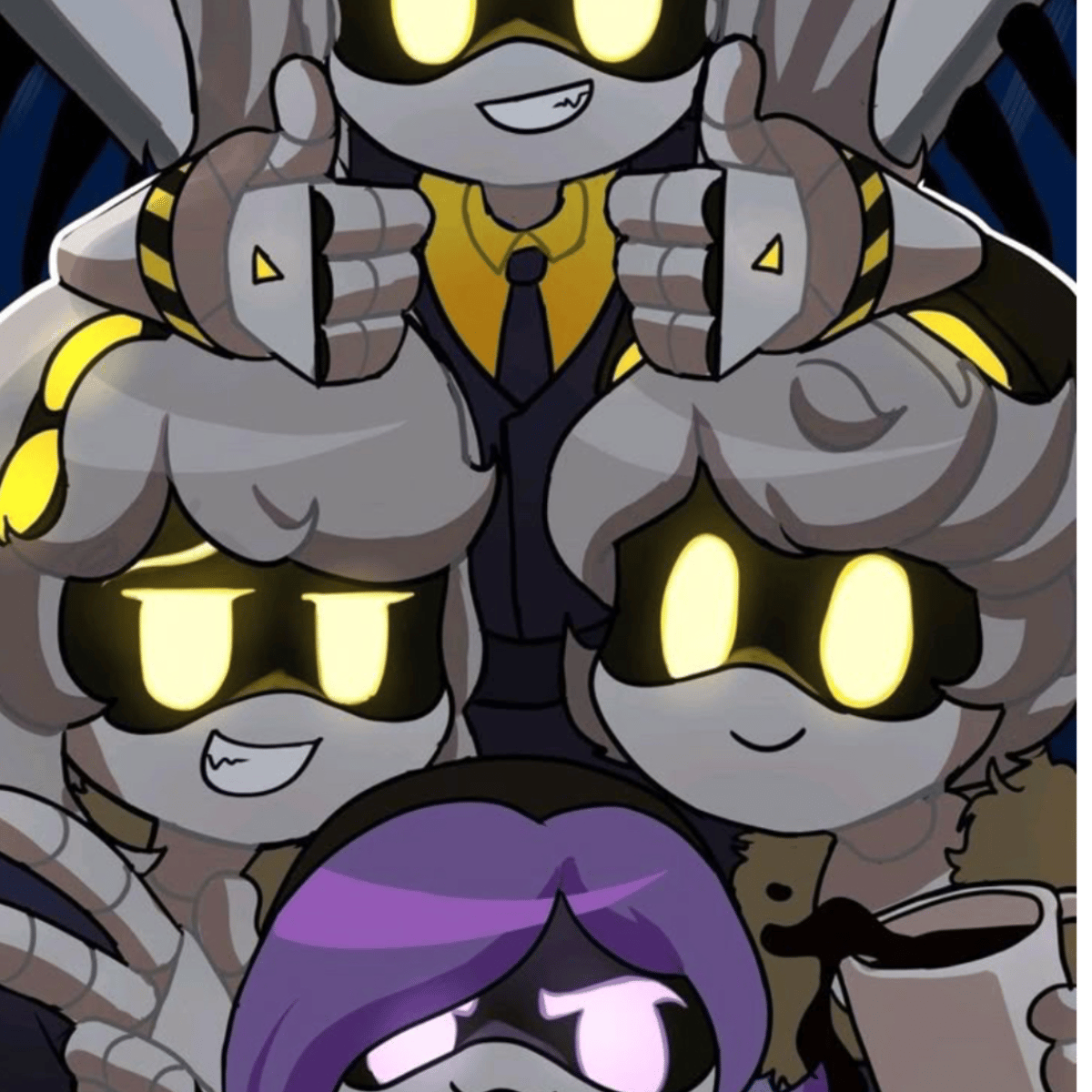 Uzi is a purple haired girl who is angsty and she loves watching anime her favourite word is bite me she is dating N who at the standing beside her And the others the are ruthless except V and N V is female Uzi is female J is female And finally N who is a male