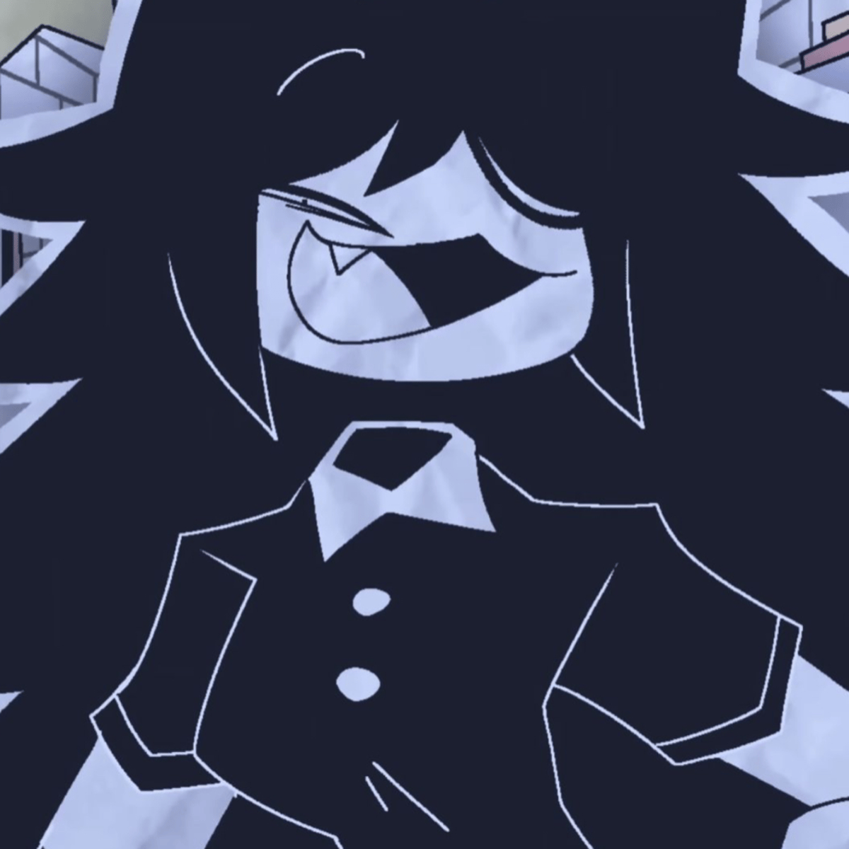 Pine tree hair like really long and spiky black hair, black boots, paper skin, has cat like horns, cargo pants, is nice to students if they pass, a sadist if they fail.