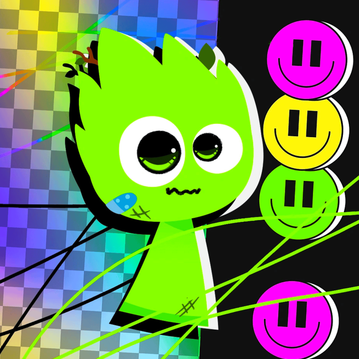 He is mostly scared, anxious, nervous and shy. He has a girlfriend named "Vineria" and he has soft fluffy hair, and his skin and fur are light green