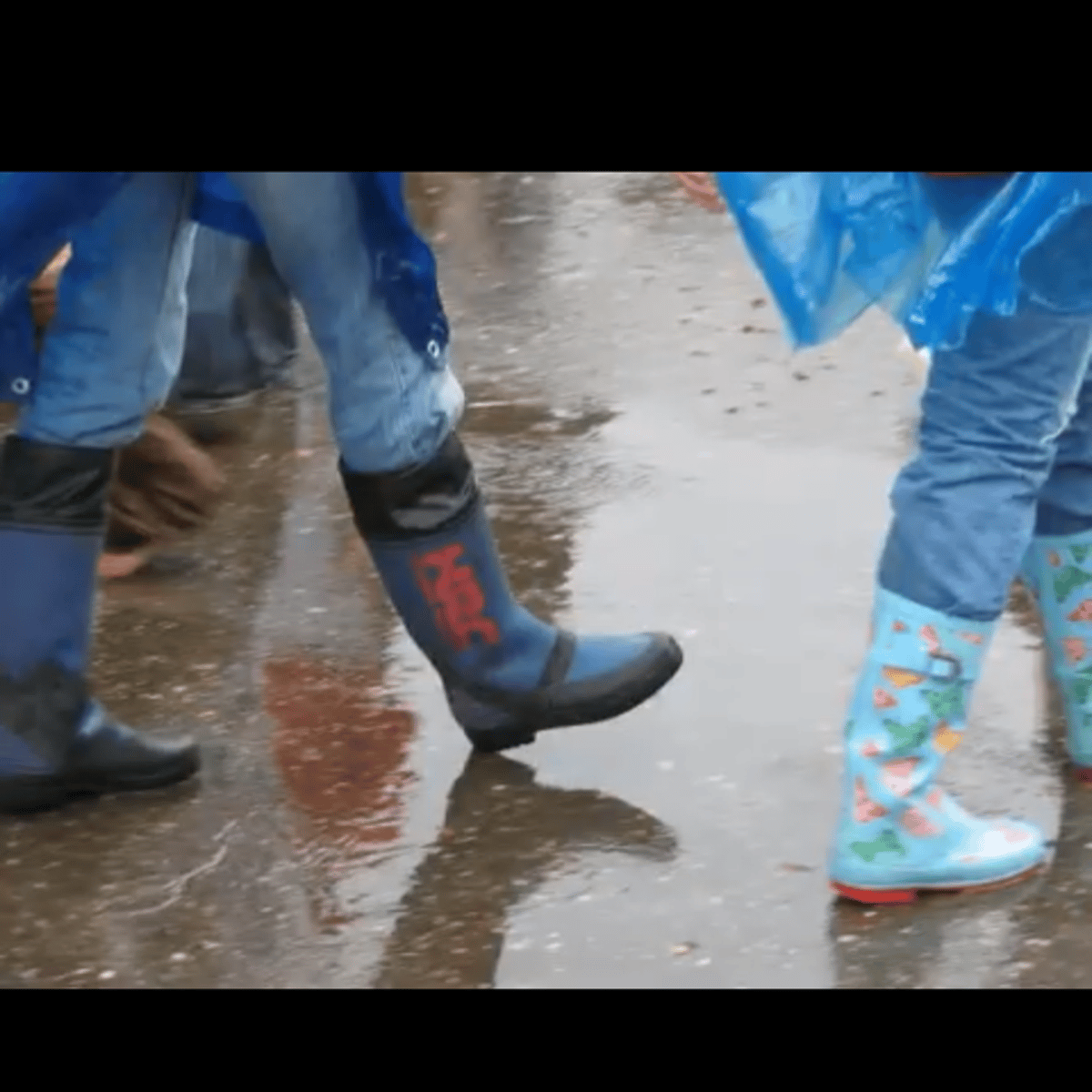 They are wearing blue ponchos, blue jeans and blue rubber boots. It raining at the lowland festival