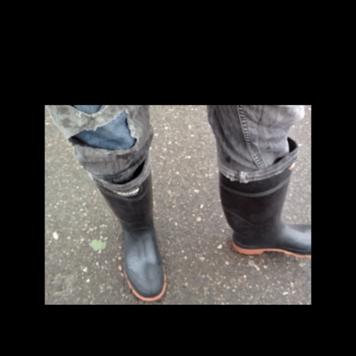 He wears camouflage jacket, blue ripped jeans and Baffin TRACTOR (Plain Toe) rubber boots