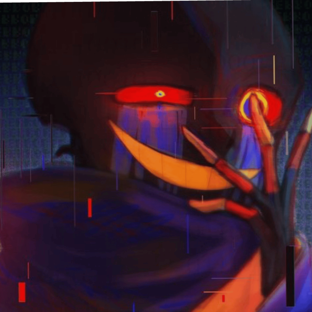 Error Sans - Destroyer of Au's and anomalies. "Simply taking out the trash", The glitchy black skeleton with his remarkable blue tear stained marks down his cheeks & mismatched buggy eyes. Awfully grumpy, bothered, annoyed, likes things to go his way, rather antisocial & aggressive / defensive.