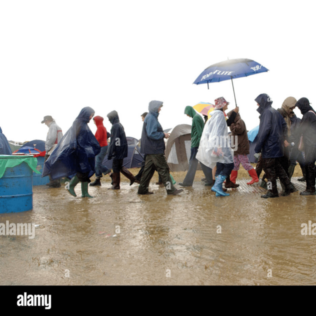 He wearing his blue poncho, blue jeans and green rubber boots with yellow soles