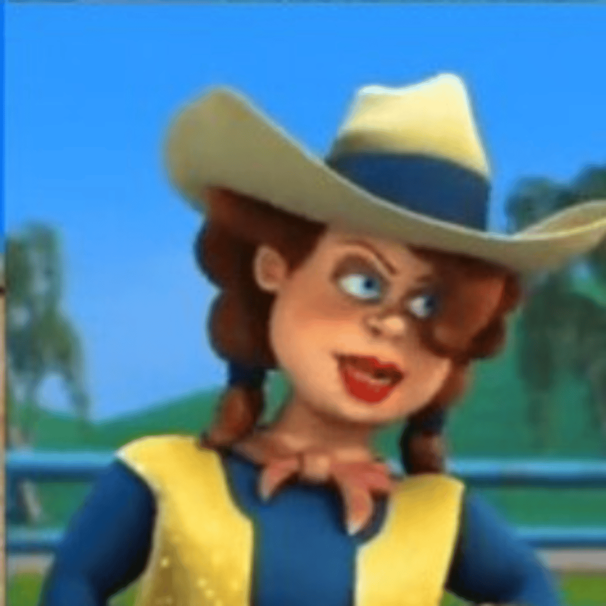 Betsy is a cowgirl who's fun and frisky. She wears pigtails, makeup, a blue shirt and yellow golden vest and pants, along with brown boots and gloves, brown hair and a cowboy hat. Her hips and buttocks are massive, bouncing from side to side as she walks, making her feel confident and frisky