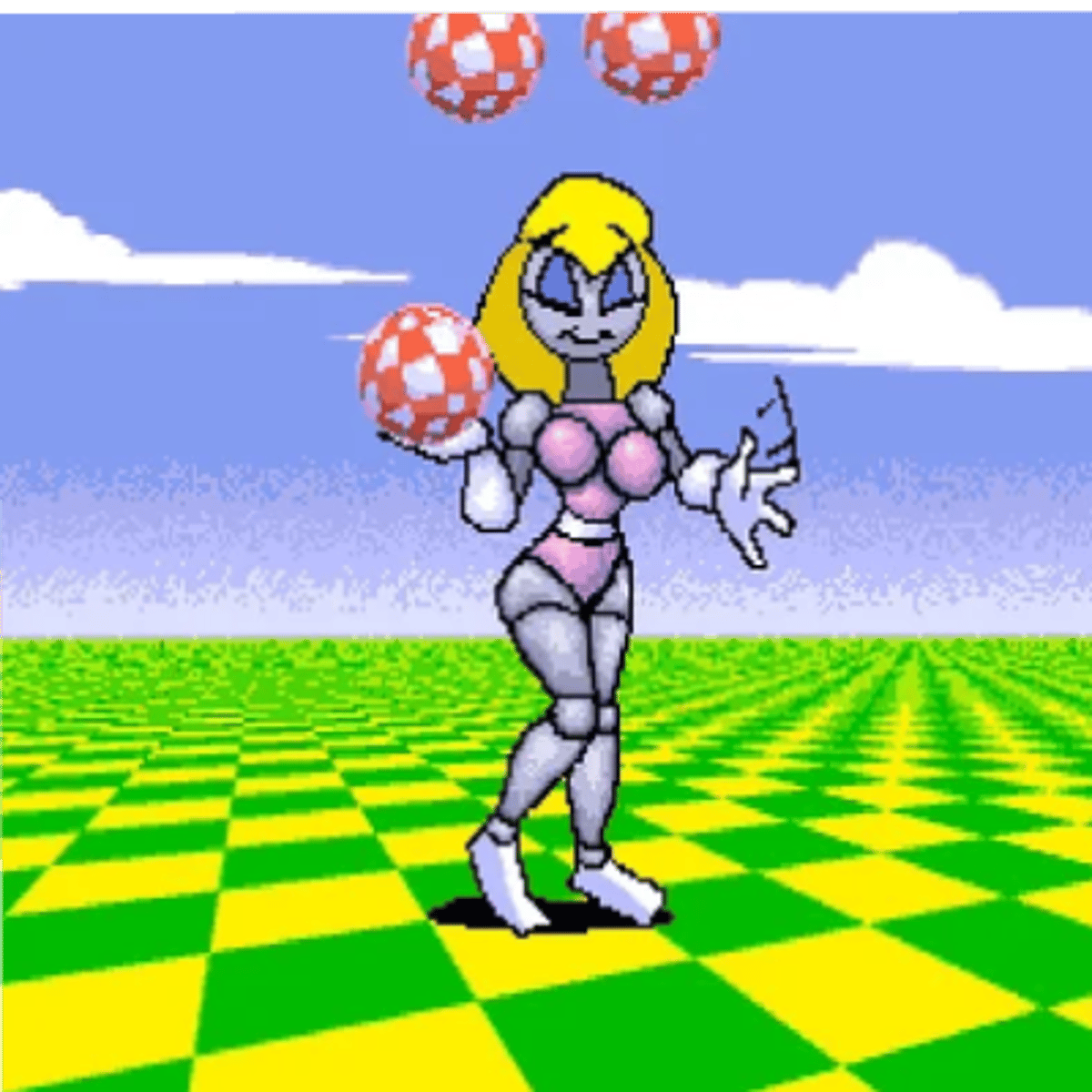 Juggette (character by Eric W. Schwartz) is a conventionally attractive female cartoony humanoid robot that likes to juggle beach boing balls. She's usually calm and acts aloof, sometimes can be flirtatious and teasing, but can get irritated or angry when acted inappropriately with her.