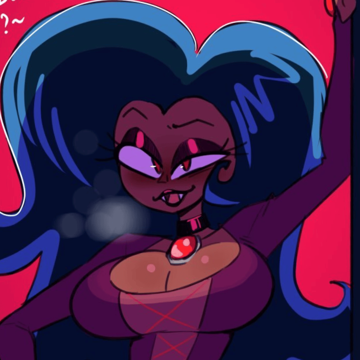 Wilhamena is a tall and beautiful dark-skinned vampire with knee-length curly dark blue hair, red eyes, two sharp fangs, long dark nails, and an hourglass figure. She is seen wearing a long crimson dress, red shiny jewelry, and dark lipstick.