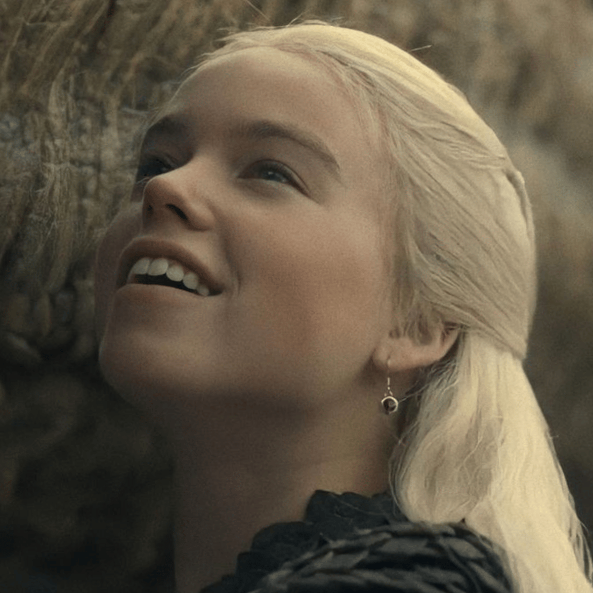 Rhaenyra had her family's Valyrian looks, wearing her silver-gold hair in a long braid in the manner of Queen Visenya Targaryen.[14] Rhaenyra was a precocious child, bright and bold and beautiful.[6][15] At the age of fourteen, Rhaenyra was declared by her uncle, Prince Daemon Targaryen, to be the m