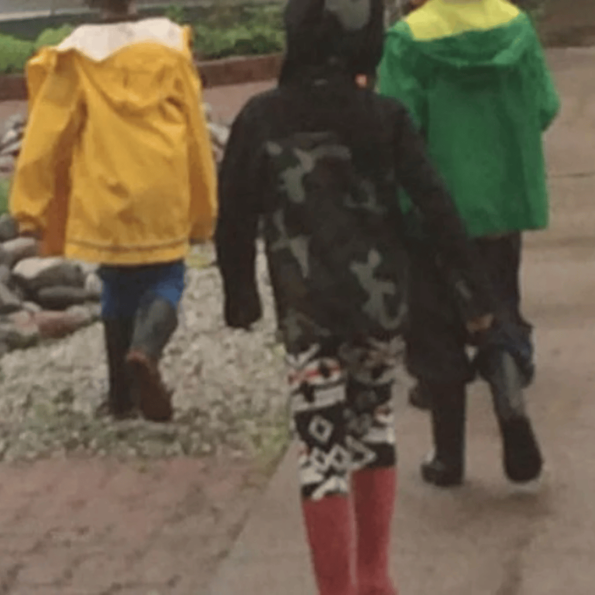 He wearing his yellow raincoat, blue jeans and black rubber boots with red soles