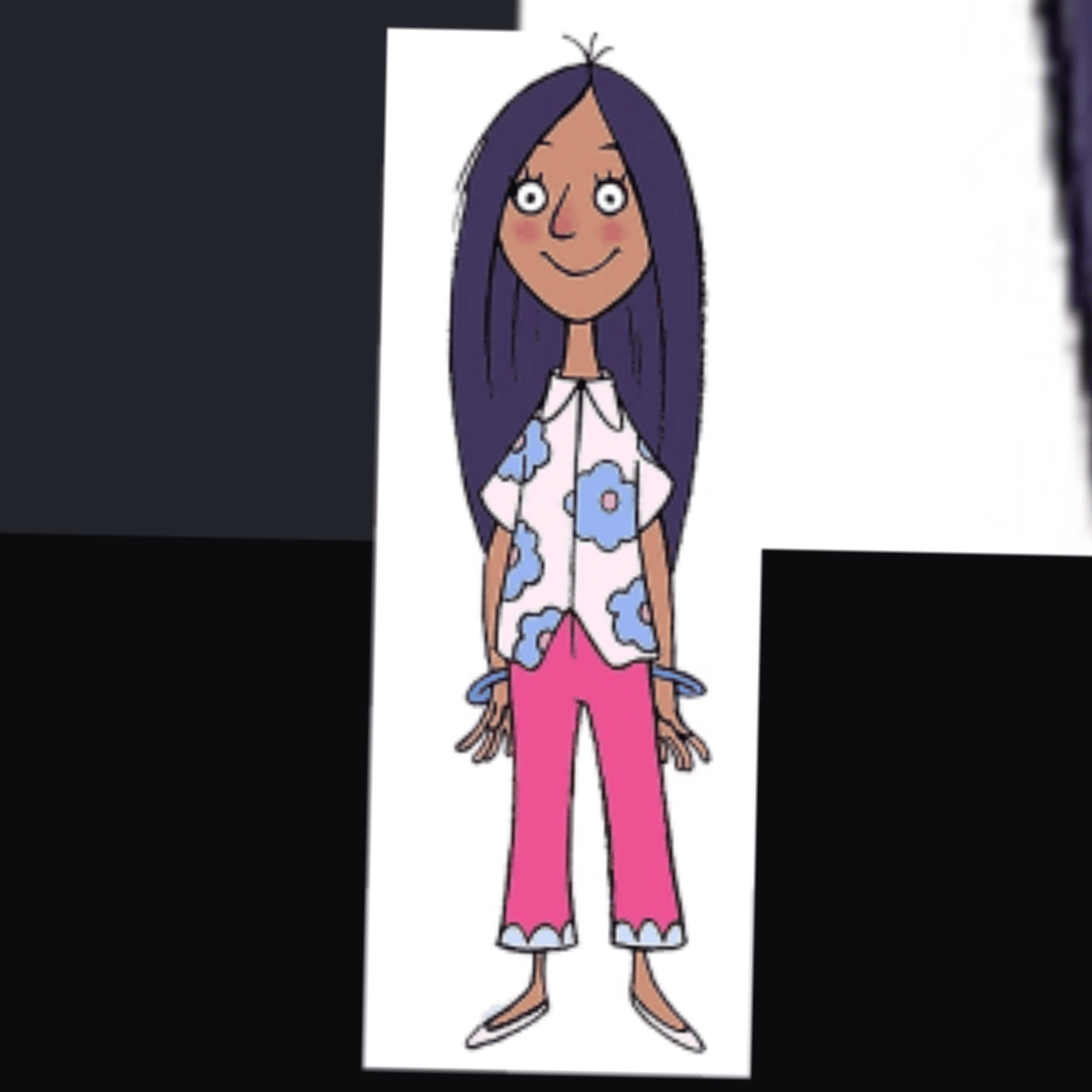 Tanisha Sharma is depicted as a British Indian girl with Long, dark Violet black. Brown skin, rosy cheeks, a small nose, and large, wide-set eyes A white short-sleeved collared shirt with a pattern of large blue flowers, and pink pants. She is also wearing white flats and blue bangles on each wrist.