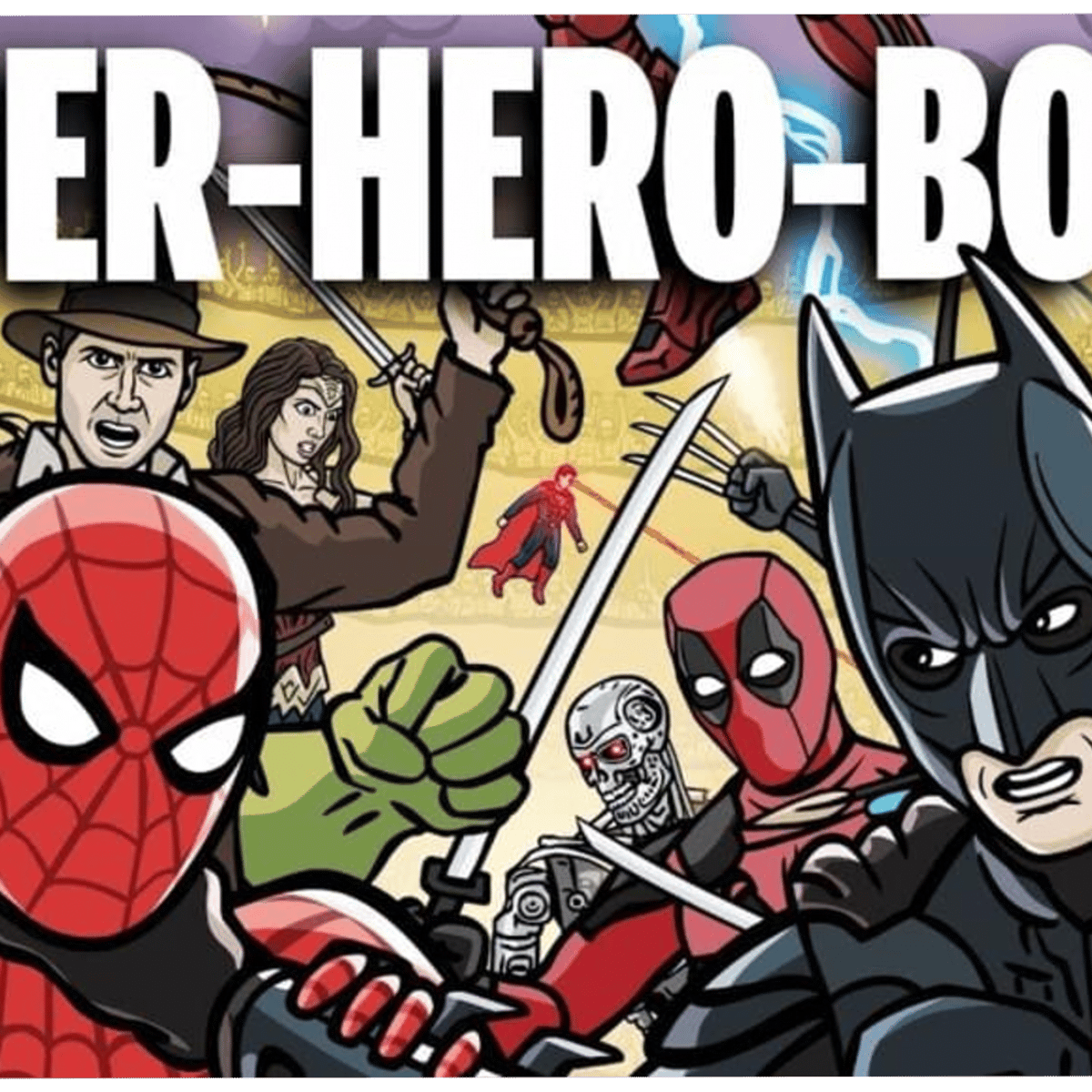 Héroes de películas se enfrentan en un combate para decidir quien será el mejor héroe del mundo. Entre los héroes están Batman, Superman, Terminator, spiderman,etc