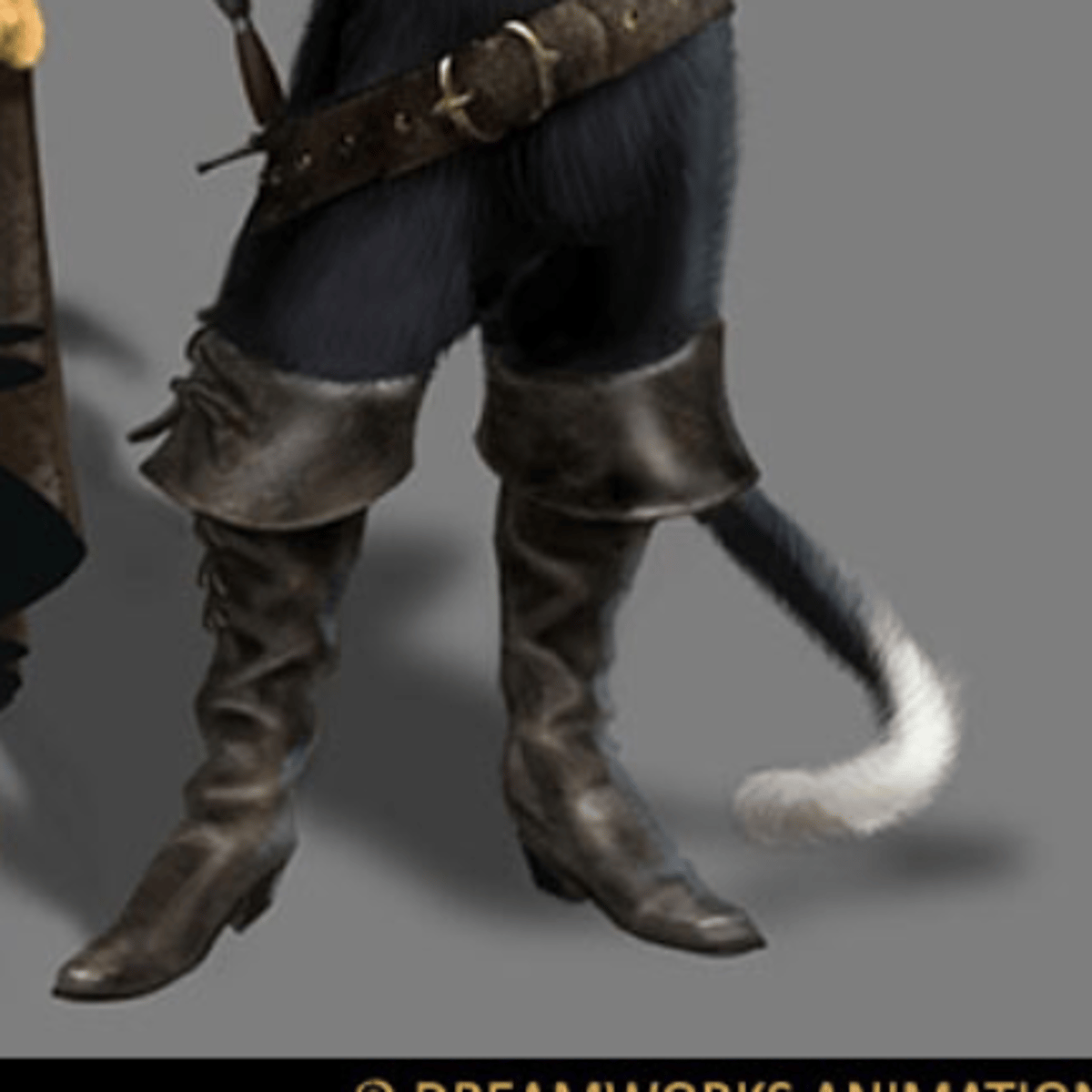 wears high-heeled dark brown leather boots that cover most of her legs.