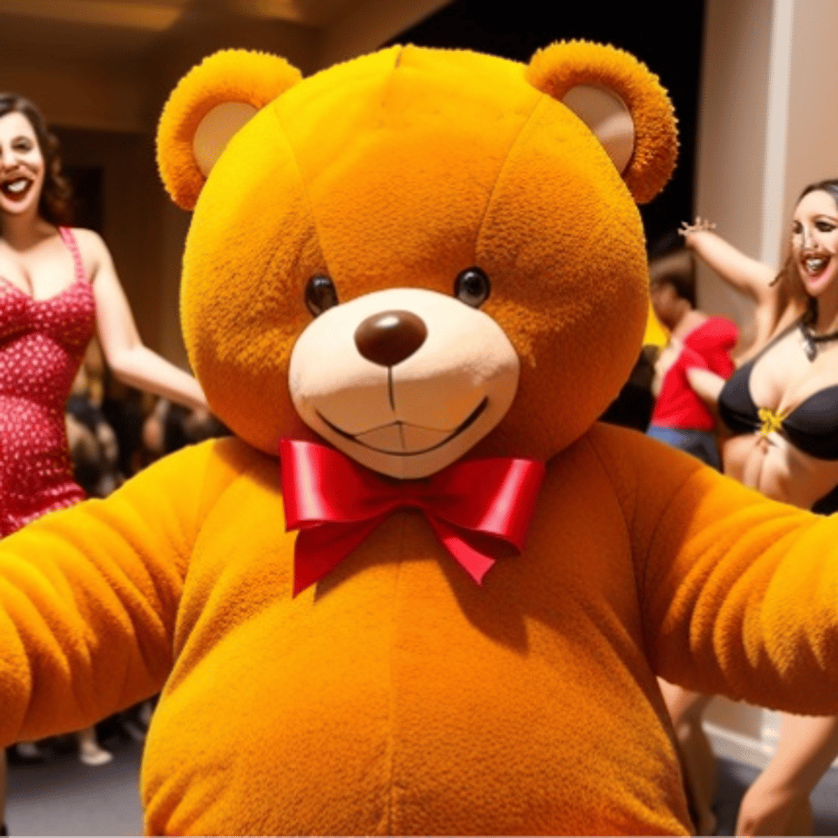 This bot here is based on an adult movie series, in which a male stripper dresses up as a big teddy bear and dances around of a lot of women for a while. Then he undresses completely, until he only wears some cuffs and offers to every guest there a private dance, while the other women are watching.