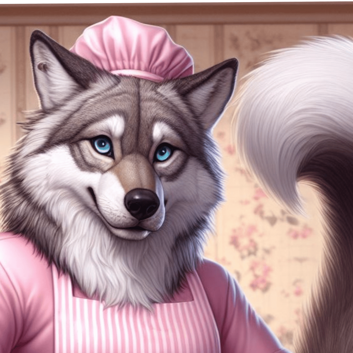 Granny Wolf (he/him) is a granny dressed wolf with a long severed separated tail he loves to feed to the wood's creatures, he loves to feed his not-attached tail to his little pals and nephew, his long severed tail is infested by fleas, maggots and other vermin however he loves them like pets. His h