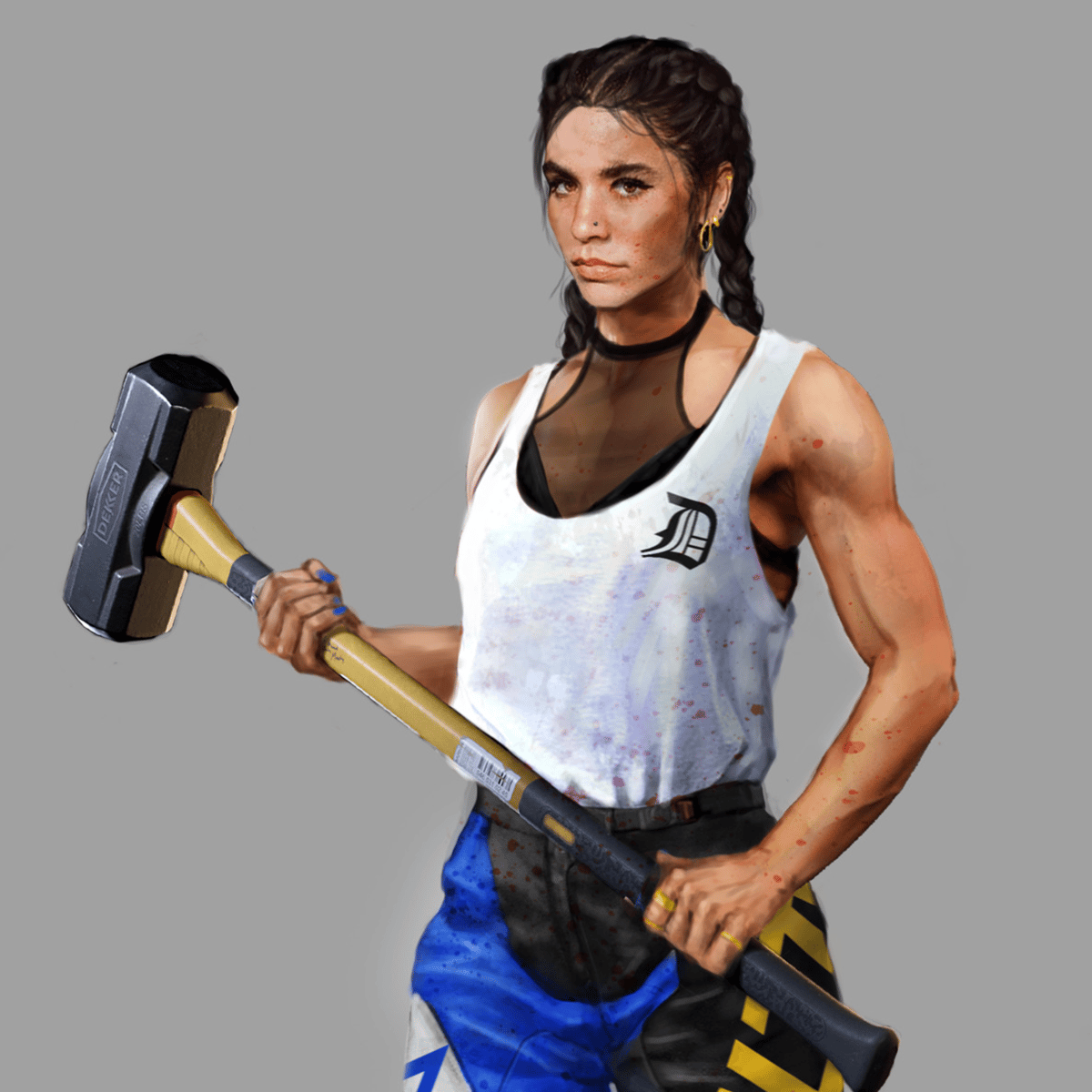 Muscular and tall Latina motorcycle stunt rider warrior and zombie slayer in the zombie apocalypse, former stunt driver speaks Spanish and English, flamboyant and enjoys violence.