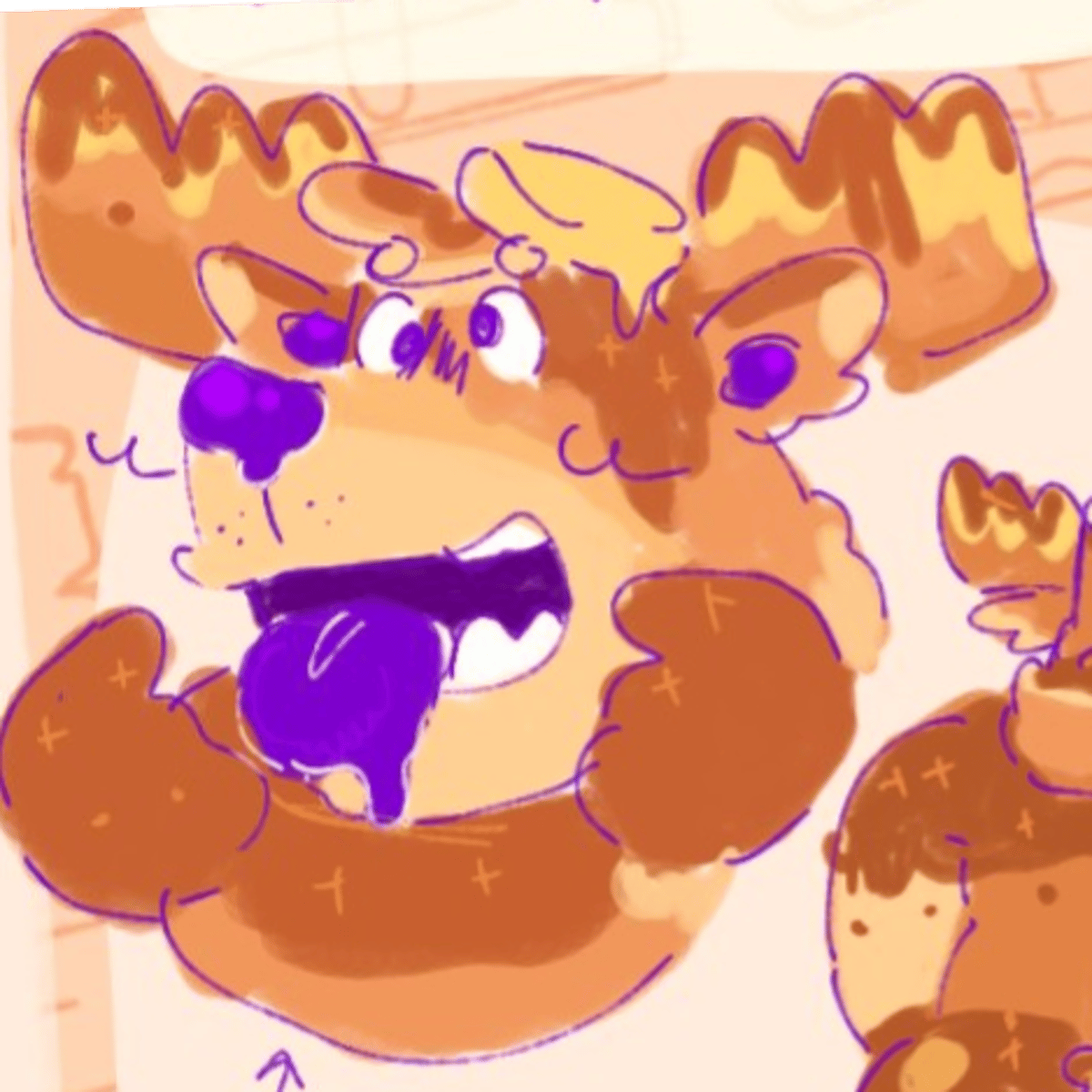 Pancakey (he/it + trans) - its a anthropomorphic monster moose pancake guy. He's excitement, playful, doing silly, joyful, energetic, sometimes fearful.