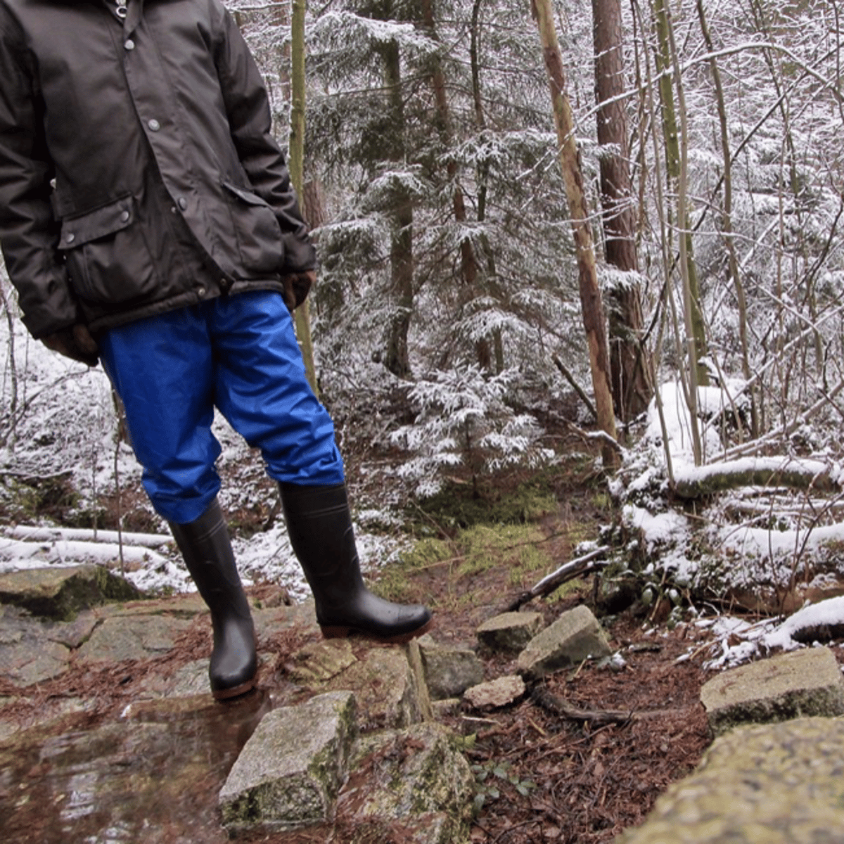 He wears gloves, brown jacket, blue rain pants and Dunlop universal wellies