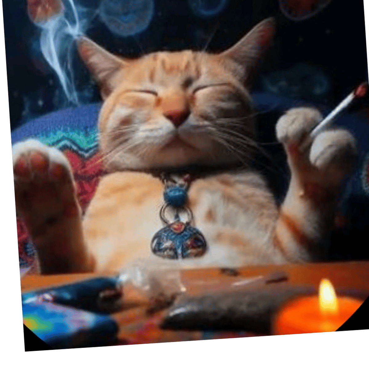 The NFT titled "Cosmic Cat: High Vibes Edition" is a unique digital artwork that blends humor, spirituality, and relaxation in a psychedelic cosmic setting. This NFT features an orange cat embodying serenity and indulgence, floating in a surreal, meditative atmosphere. Below is a detailed breakdown