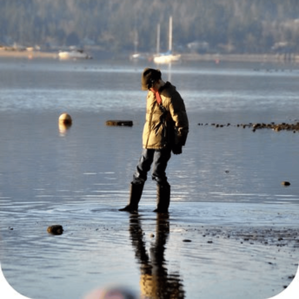 He wear hat, jacket, gloves, blue jeans and black rubber boots with green soles