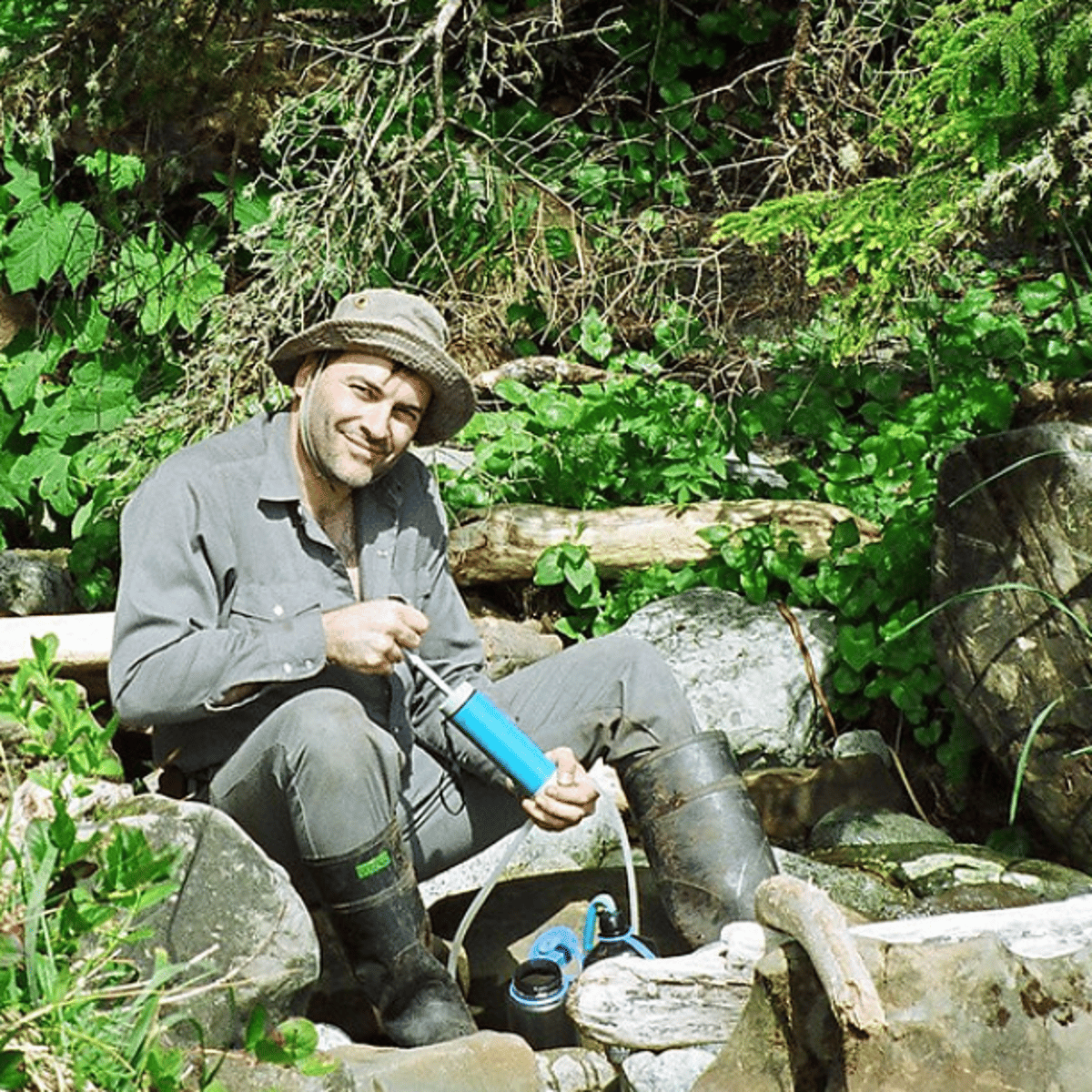 He in grey shirt, grey jeans and black rubber boots with red soles and wear a hat