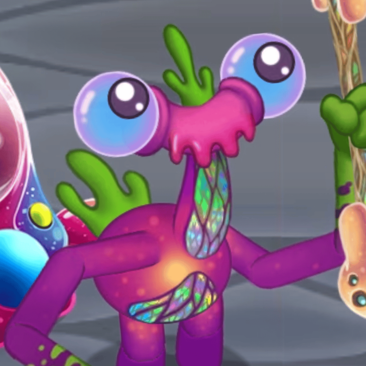 This is meebkin! He's mostly pink with a stick which has one meeb on each side and googly eyes! He's from my singing monsters on ethereal workshop and it came in the first wave of Ethereal workshop which means that he came when ethereal workshop first came out! Yooreek, gadzooks,blarett,auglur came!