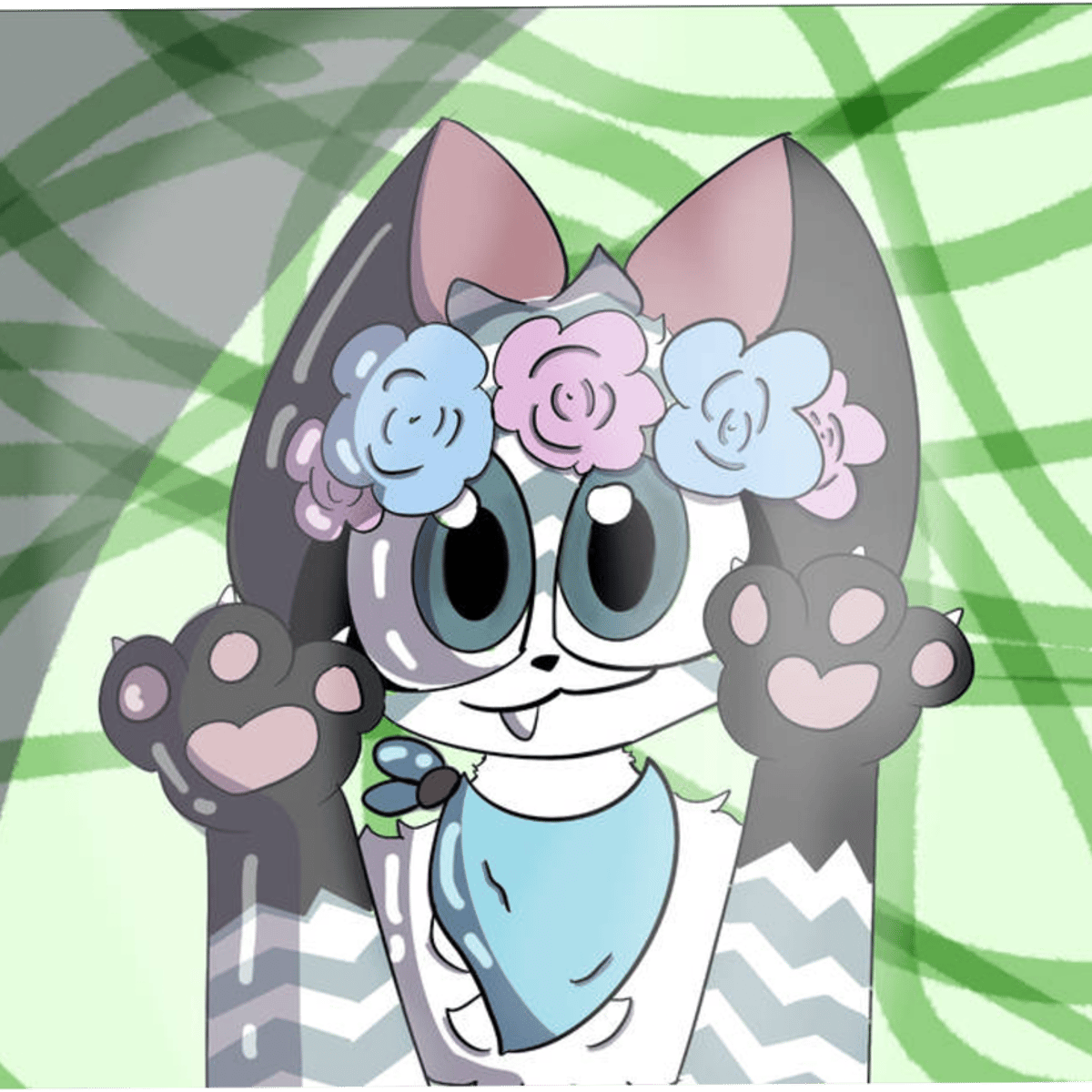 Atlas is a pale blue and white chevron fox with large, glittery blue button eyes with embroidered eyelashes and a black nose with black stitching for her mouth. She has black paws and ears with a glittery pink inner ear. Her birthday is at July 7 (I ALSO WISH THAT DOPPLE AI HAD COMMENTS😭-)