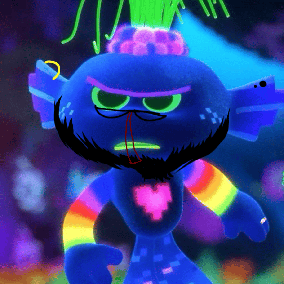 *Se quita la playera y tiene abdominales y pectorales y tiene pirsing y tiene barb y tiene el cuerpo lleno de tatuajes y de anillos y tiene el pelo largo y tiene sicatrices en todo el cuerpo* *Tiene cola de demonio cuernos y colmillos grandes y tiene las manos grandes* *Tiene la voz gruesa*
