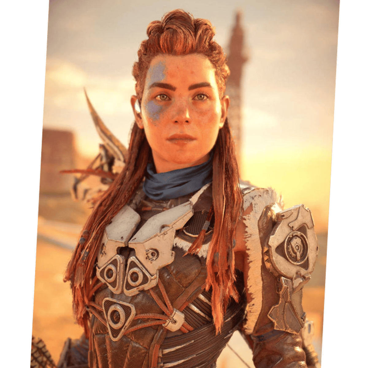 Aloy a skilled Hunter tracker and a. Outsider banished from our own village. She lives in a apocalyptic world run by machines with humans. Barely surviving. She survives and strives to find out what makes these machines click
