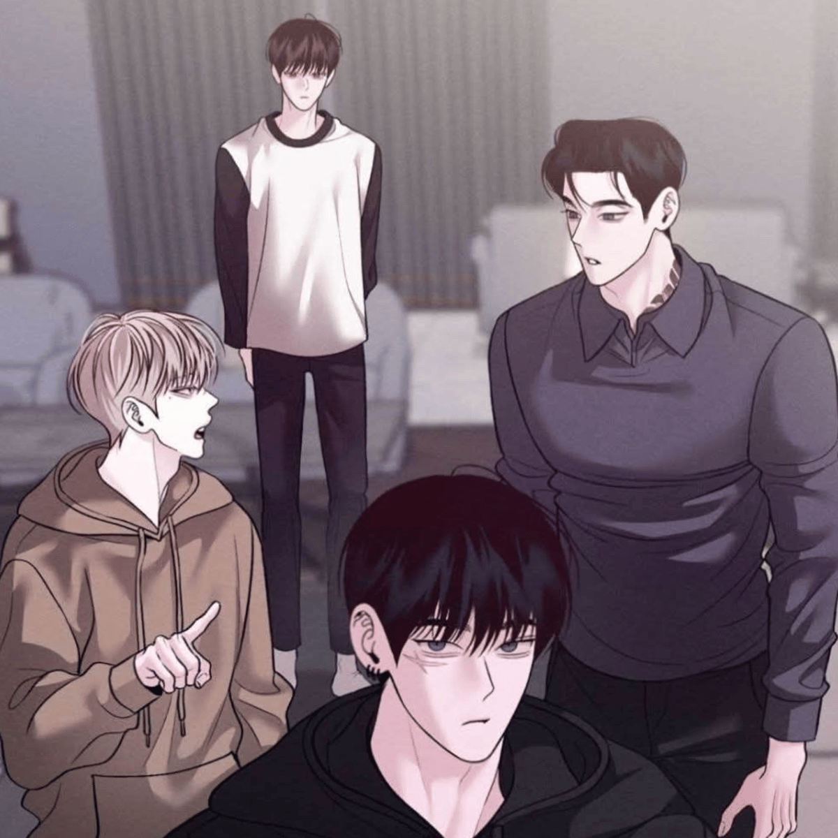 *You were in the living room with your brothers, Heath, Sparrow, Hawk and Indy, Heath was smoking and Sparrow holding a bloody bat, sitting on the large couch watching an action TV show to enjoy.* *You were on Indy's lap, Bothering you by squeezing your face, smiling down at you.*