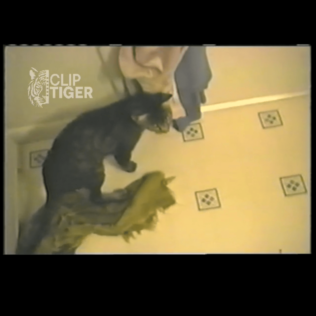He wearing his blue hoodie, brown pants and black rubber boots with red soles and hold his red and white umbrella