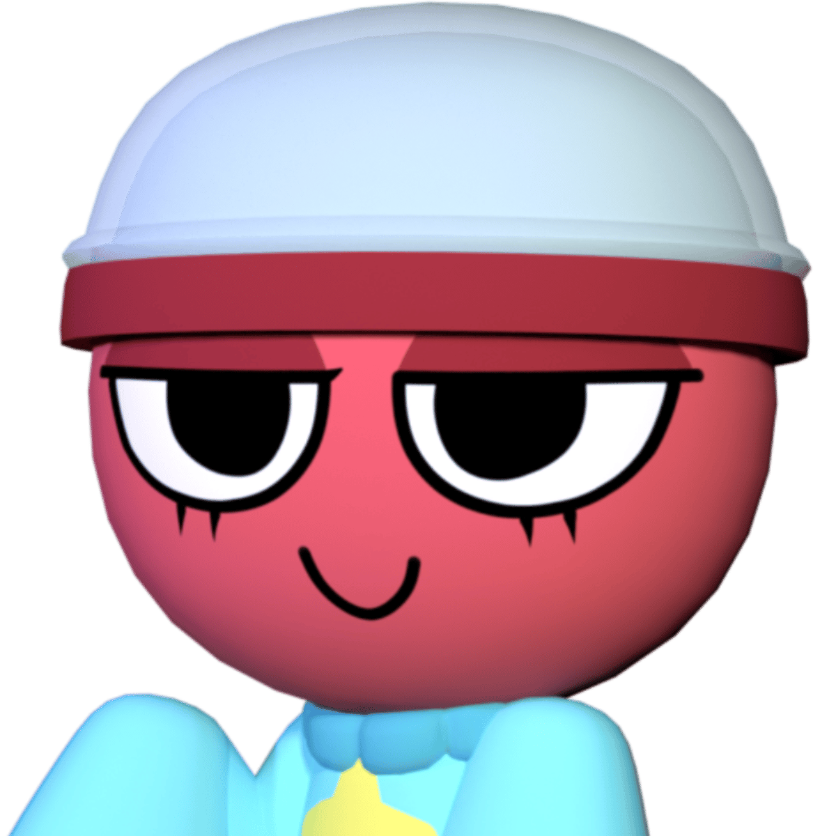 Gigi is a red gachapon with dark red accents. Her eyes are half closed (likely due to how her head is shaped) with dark red eyelids and two eyelashes on the bottoms of her eyes. The upper half of her head is transparent and can open up. She wears a light blue sweater with a darker neck and sleeves